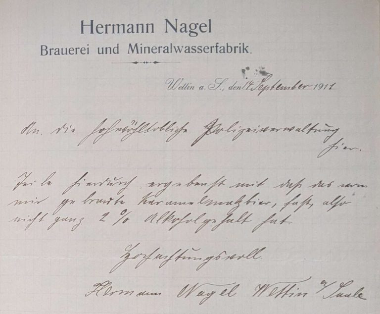 Weitere Recherche schien angebracht. Im Wettiner Stadtarchiv fand sich tatsächlich nach längerer staubiger Suche eine Akte mit dem Titel "Anlage einer Bierbrauerei und Bierhandel", beginnend 1889. Trotz vielversprechendem Titel, war der Inhalt leider recht dürftig. Immerhin enthält sie eine Erwähnung der Brauerei Nagel. Im Jahre 1911 verfasste der Inhaber Hermann Nagel höchstpersönlich einen für die höhere Landesstatistik benötigten Bericht, in dem er angibt, dass "das von mir gebraute Karamelmalzbier, fast, also nicht ganz 2 % Alkoholgehalt" habe.